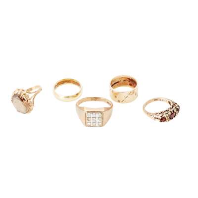 to include a 9ct gold ring with bright cut detail; a plain wedding band, stamped 585; a 9ct gold and colourless gem set ring, a garnet and pearl set ring; a 9ct gold smokey quartz set ring