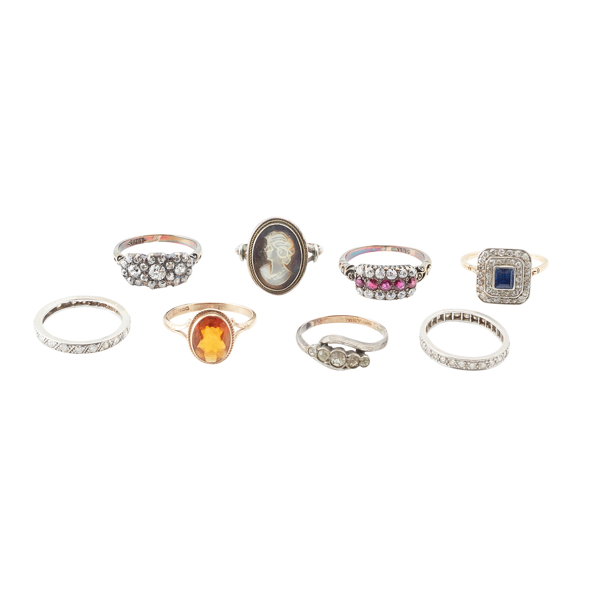 to include a diamond set cluster ring, a sapphire and diamond set square cluster ring; two diamond set eternity rings; a Victorian ruby and diamond set cluster ring and three costume rings