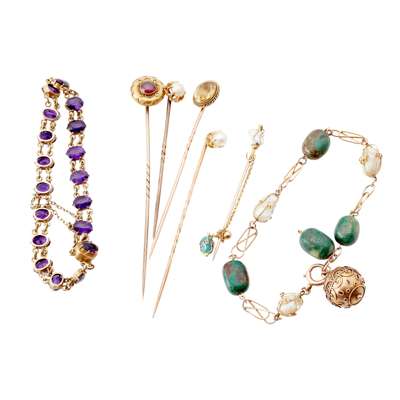 to include a cased pearl tie pin, and another similar; a citrine set tie pin, a Victorian paste set pin and a pearl and turquoise set tie pin; together with a Victorian pearl and turquoise set bracelet, with a globular charm, indistinctly marked and an amethyst set bracelet stamped 830