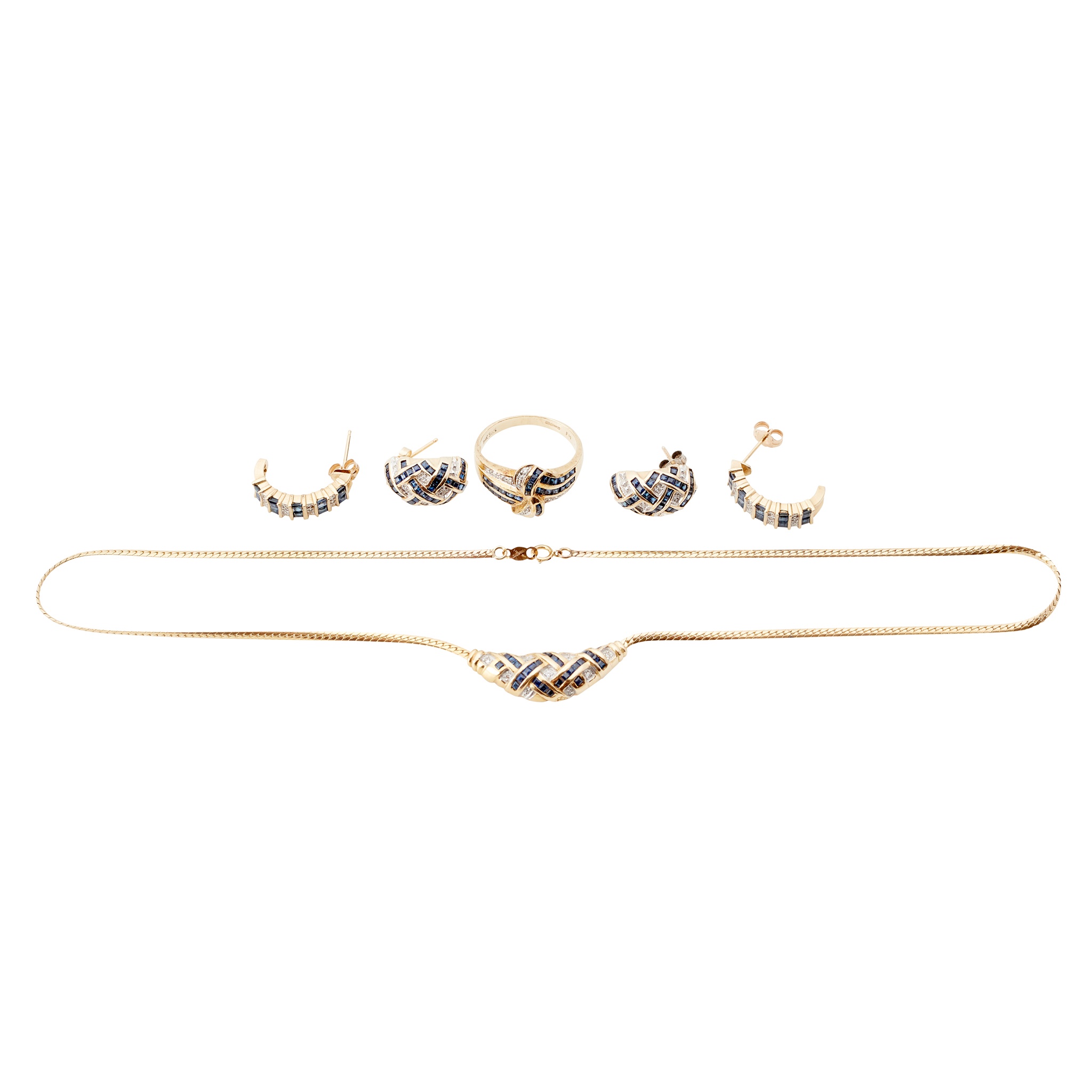 to include a ring, necklace and earrings, all with cross-hatched channel set sapphire motif and small round brilliant-cut diamond detail, all stamped 14KT; together with a pair of associated sapphire and diamond set earrings, also stamped 14KT