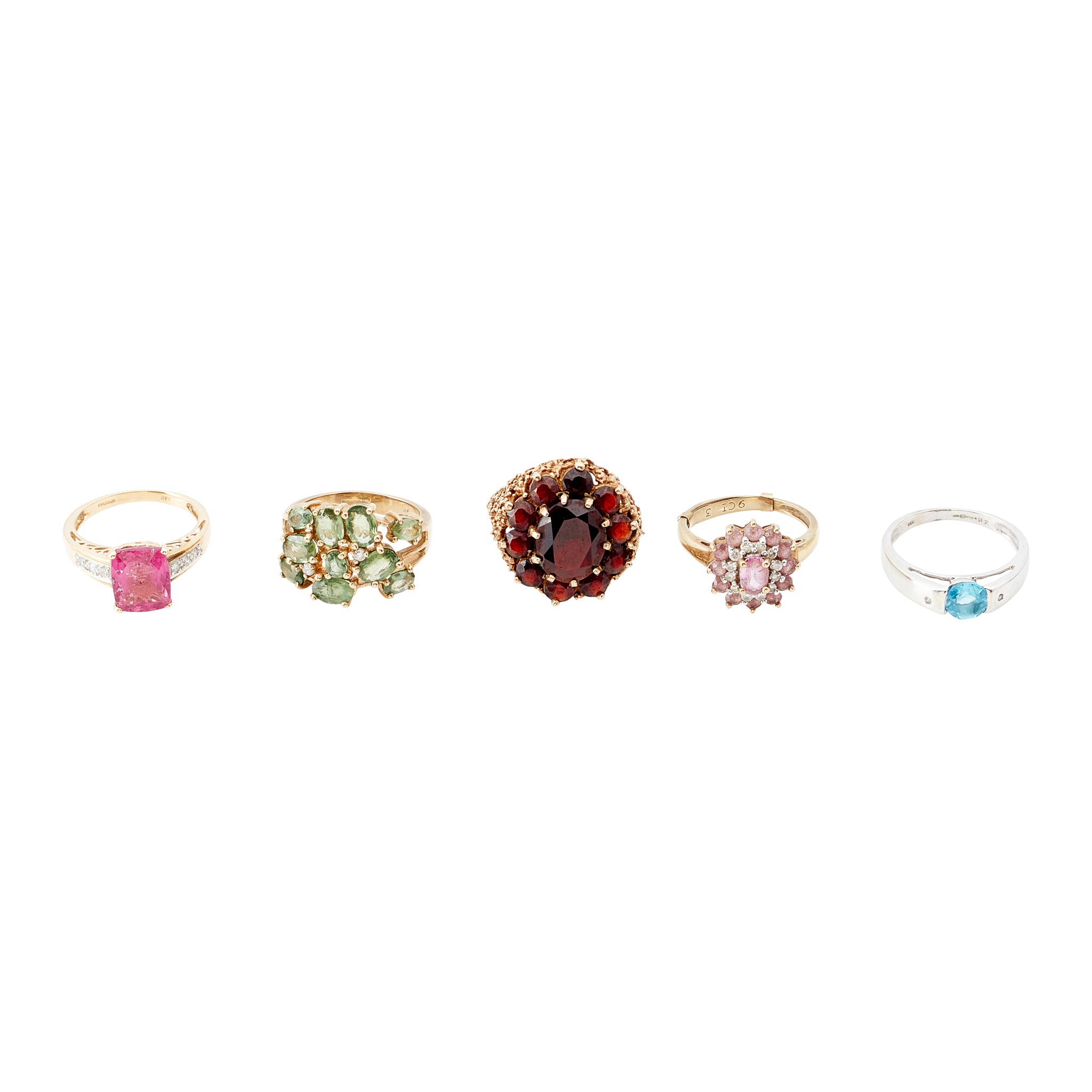 to include a 9ct gold garnet set cluster ring, a 14ct gold pink tourmaline and diamond set ring; a 9ct gold green tourmaline and diamond set cluster ring; a 9ct gold blue topaz and diamond set three stone ring, and a pale pink tourmaline and diamond set cluster ring