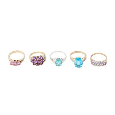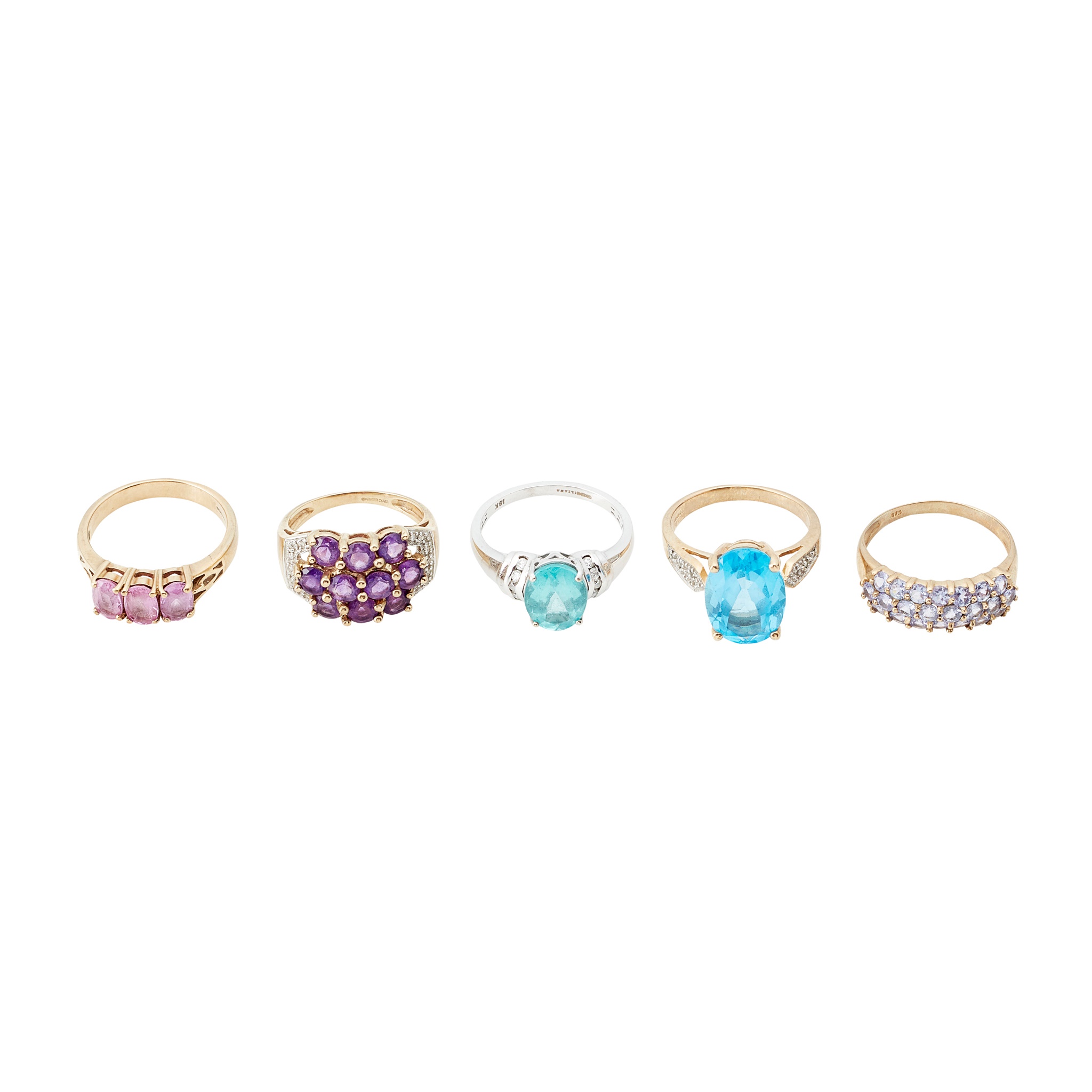to include a 9ct gold blue topaz and diamond set ring, an 18ct gold apatite and diamond set ring; a 9ct gold amethyst and diamond set cocktail ring, a 9ct gold pink tourmaline set ring and a 9ct gold purple gem set ring