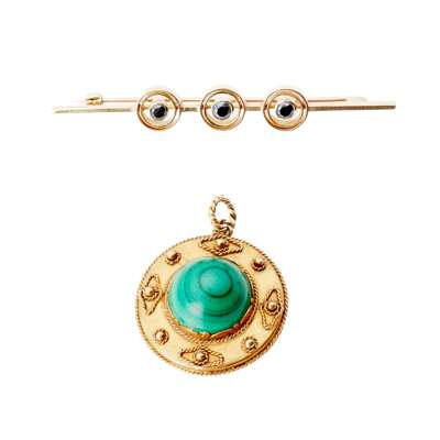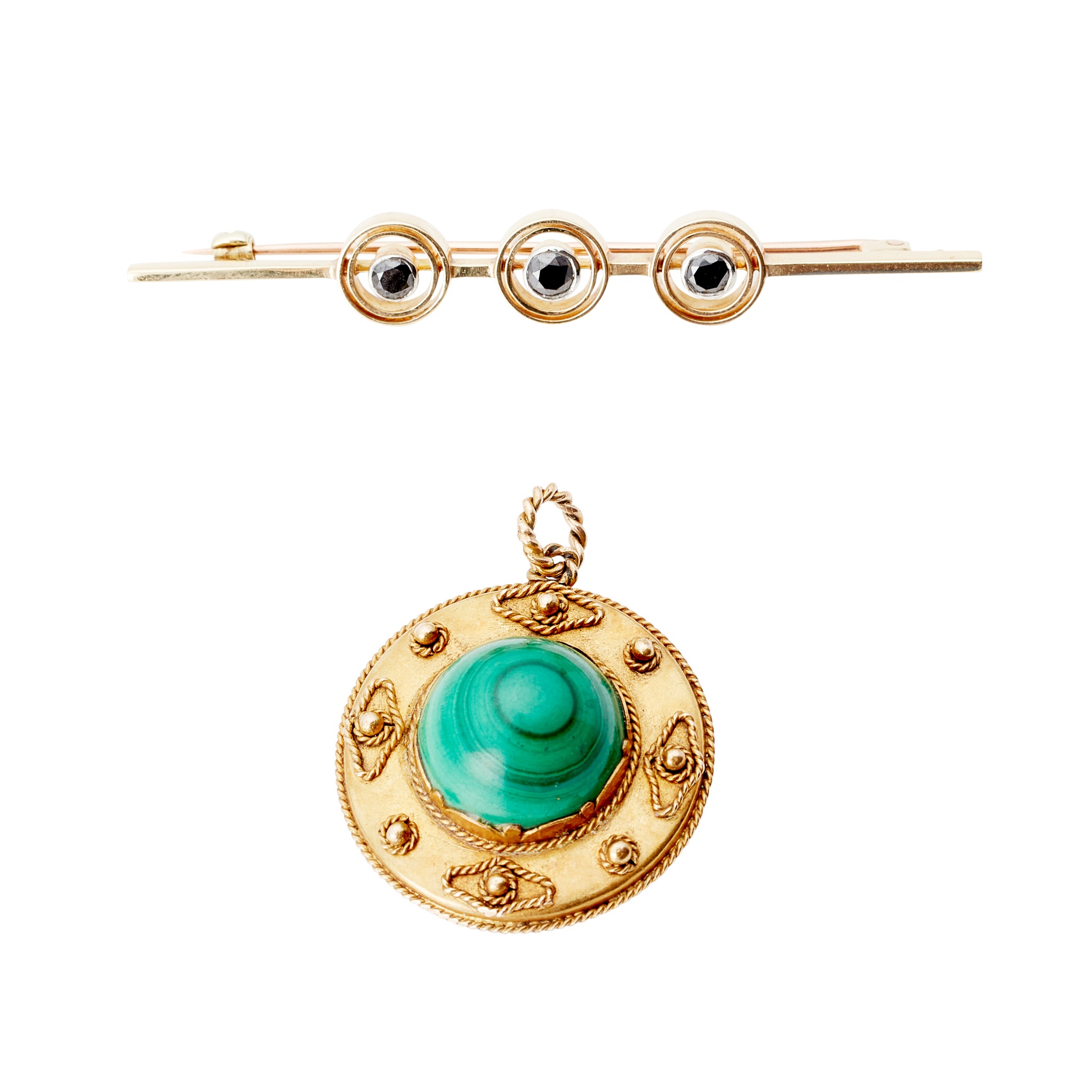 collet set with three round brilliant-cut black diamonds in open borders, to a plain bar brooch, stamped 15ct; together with a Victorian pendant, set with a central malachite cabochon in a beaded border, glazed panel to reverse, unmarked