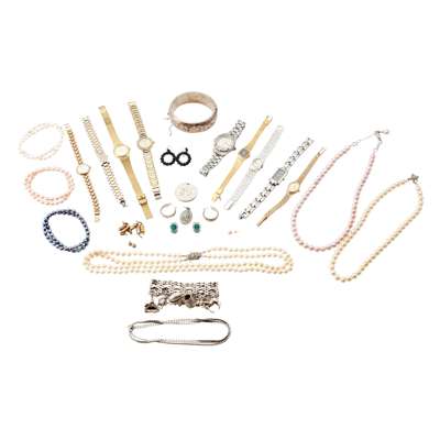 to include various cultured and faux-pearl necklaces and bracelets; a silver charm bracelet and bangle; various wrist watches etc.