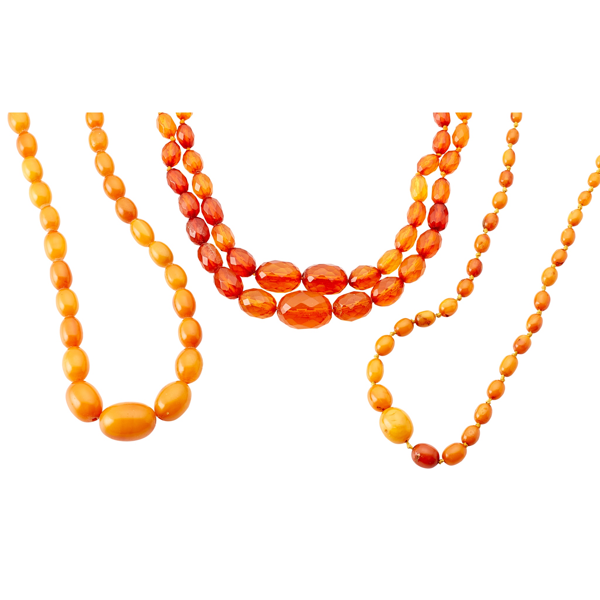 composed of a strand of graduated oval amber beads; together with another smaller and a double strand faceted imitation amber bead necklace