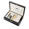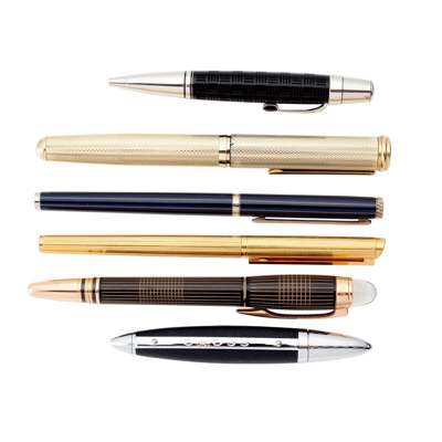 the polished lacquered case with onset gilt plaque, the interior with two lift out trays, each for ten pens, document space under, with key; together with a rose metal mounted ballpoint Mont Blanc pen, similar to Starwalker, the cap with logo in polished clear cabochon, engraved fittings, the screw off cap and body with simple geometric gilt line detail; and a Mont Blanc ball point pen, Boheme, black line engraved body, white metal fittings and clip, short length; Cross, black leather cased body, chrome fittings and clip, short size; Alfred Dunhill, a blue resin body with guilloche ground, white metal fittings and cap; two gilt cased Alfred Dunhill, fountain pens, one with engine turned decoration to the body and pull off cap, the other more slender and with plain line decoration, original 14K nib
