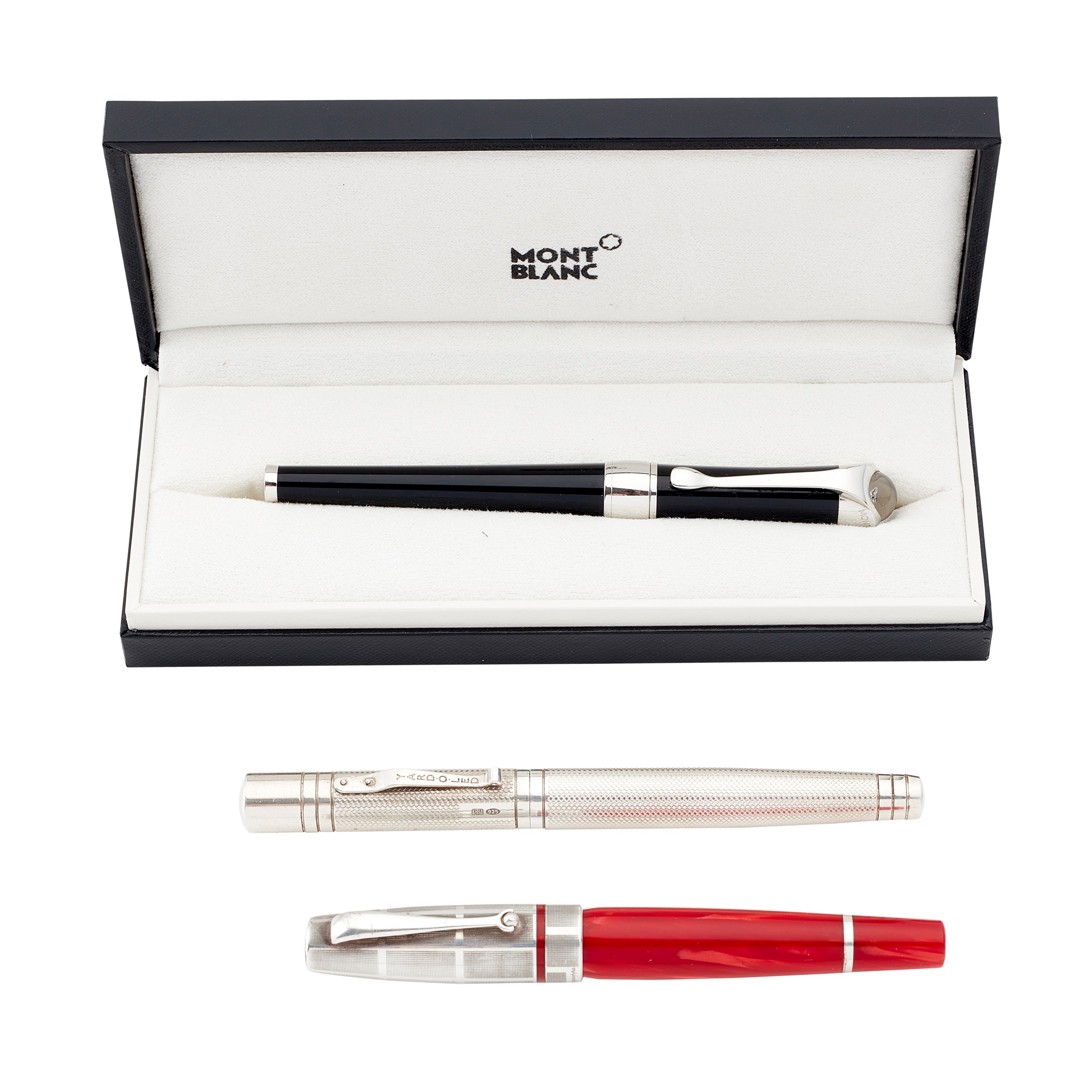 the screw off cover with faux diamond Mont Blanc symbol to the top, black with white metal fittings, in a fitted case with a booklet; together with a Yard-o- Led silver cased ballpoint pen, Birmingham 2017, the whole case and cap with engine turned decoration, blank cartouche for engraving, screw off cap; a silver and red cased Montegrappa ballpoint pen, the screw off cover with simple chequer engraved panels, mottled red lacquer lower case