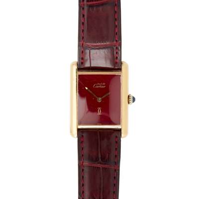 Tank, red dial, baton hands, sapphire cabochon to the crown, quartz movement, original Cartier strap