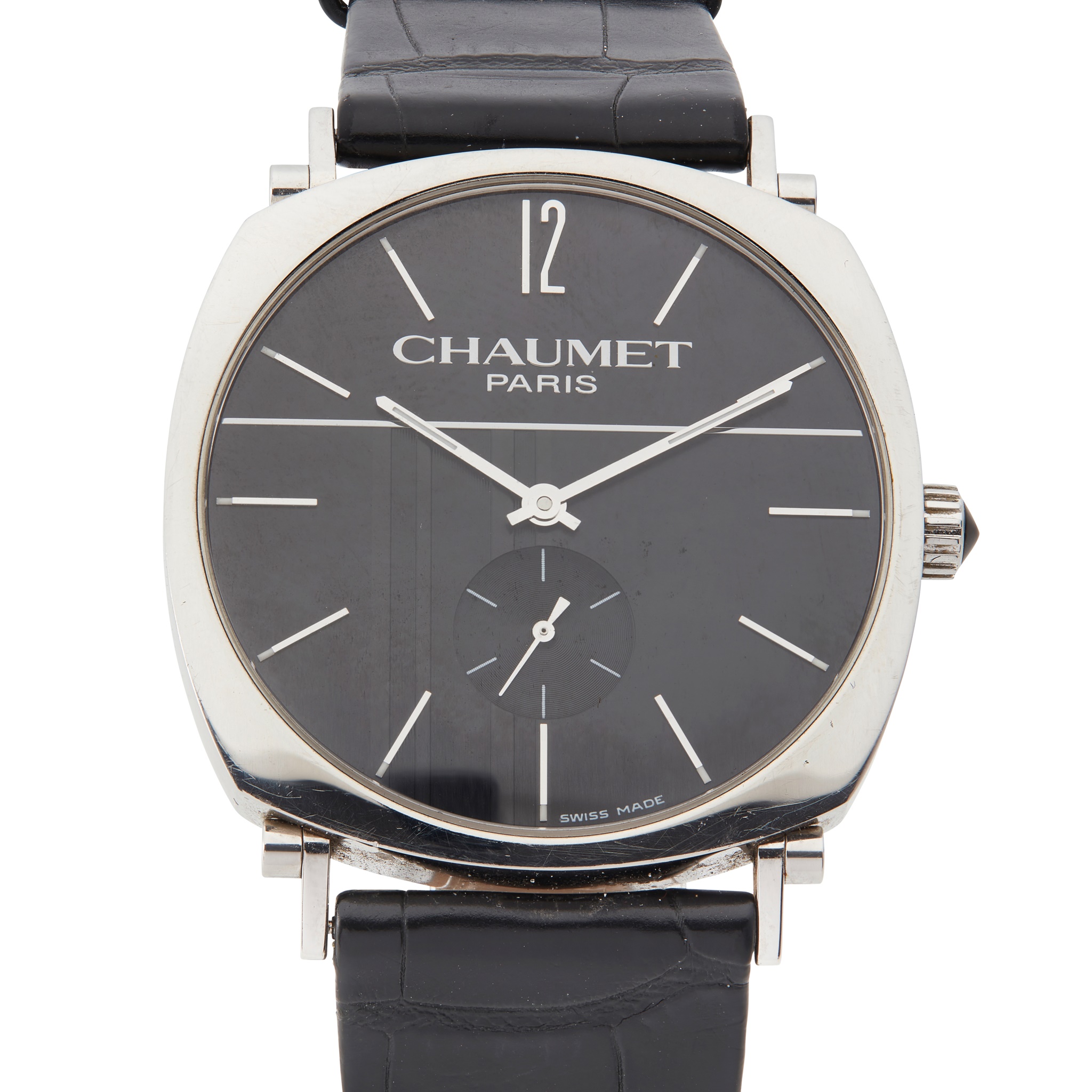 Dandy 1228, the plain polished rounded square case with a black dial, bold polished baton indicators, subsidiary seconds dial, cabochon to the crown, manual movement, Chaumet strap