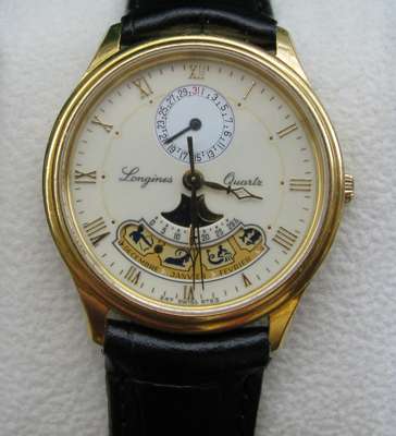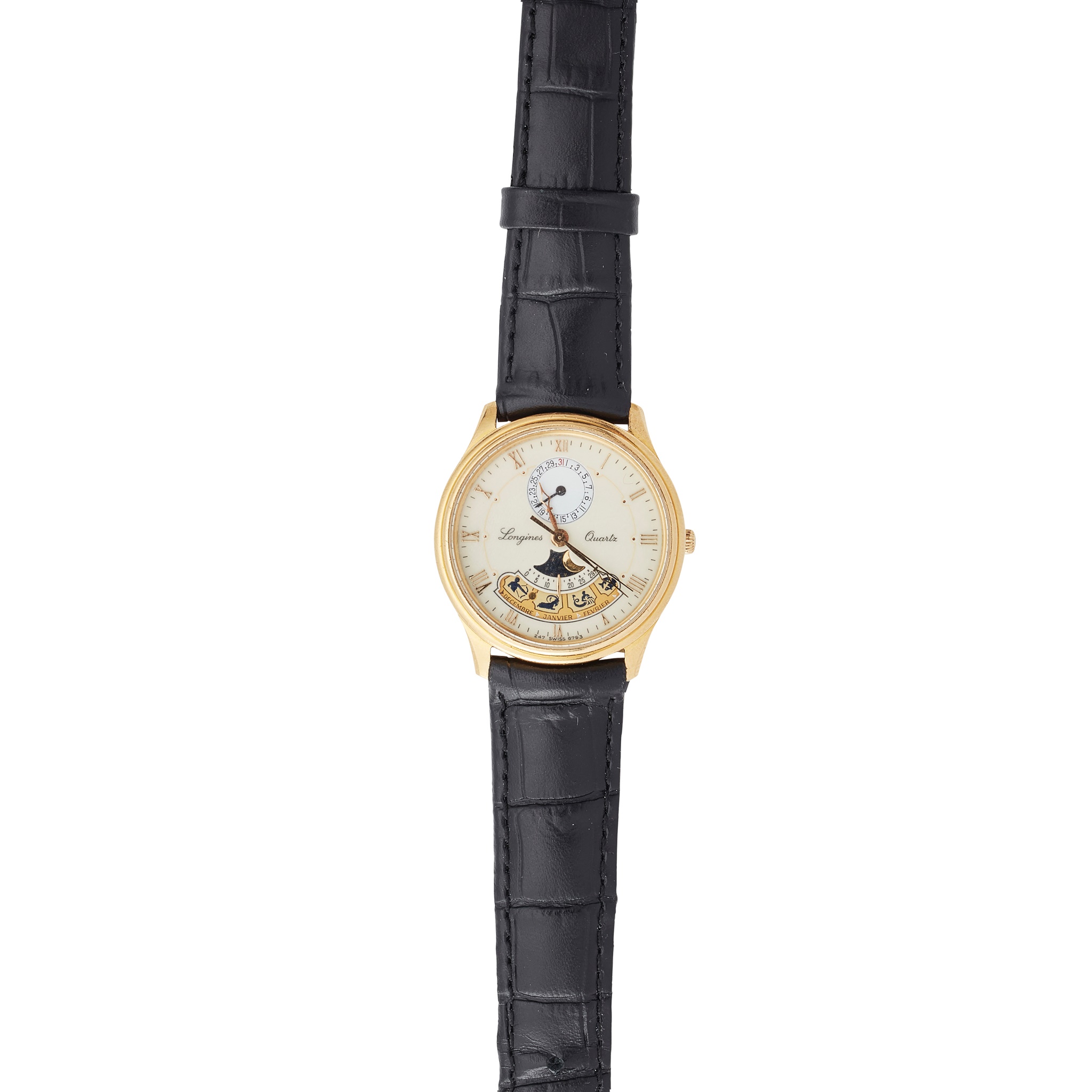 Planetarium, cream open dial with gilt Roman numerals, sweep second hand, subsidiary date dial, lower arch for month and moon-phase, leather strap, Longines gilt buckle