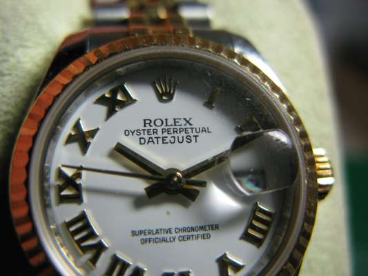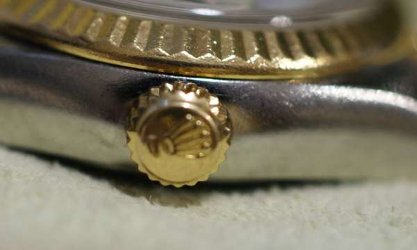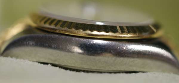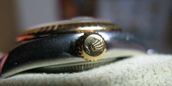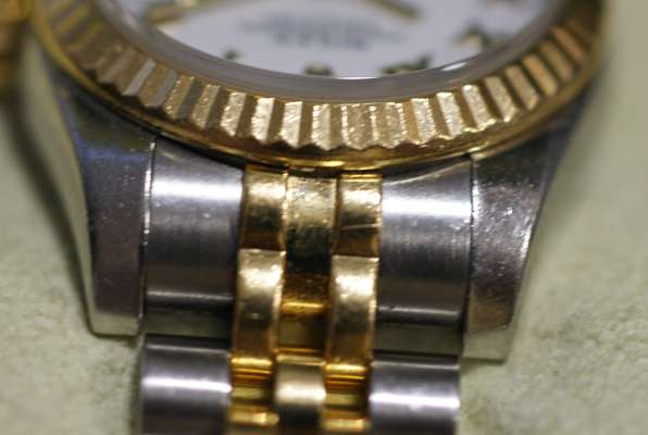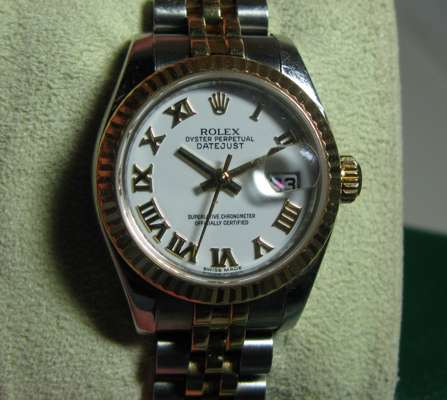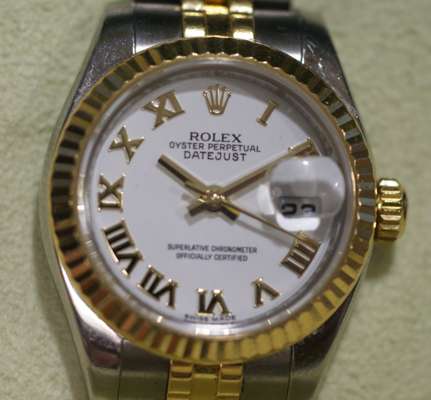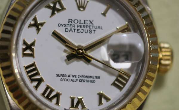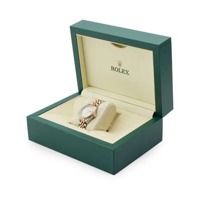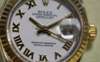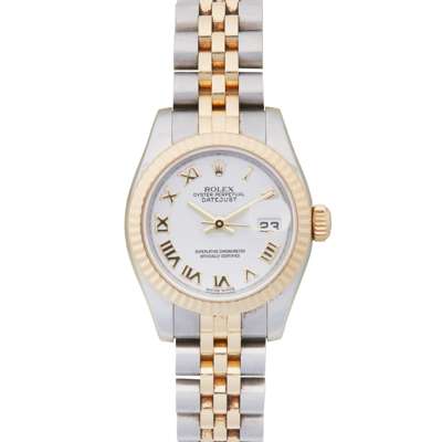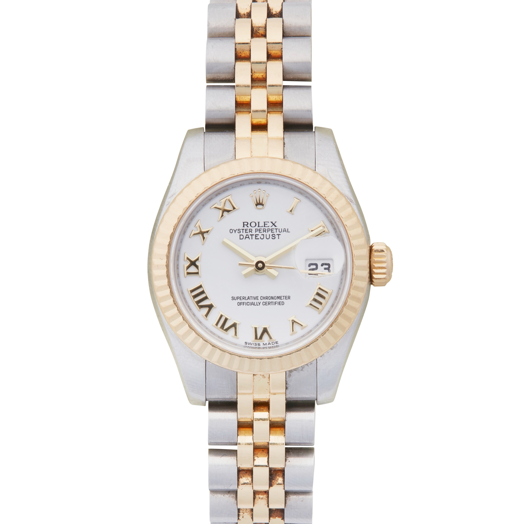 Datejust, the white enamel dial, with polished gilt numerals, sweep second hand, date aperture, gold bezel, screw down crown, gold and stainless steel bracelet, hidden clasp with box and papers