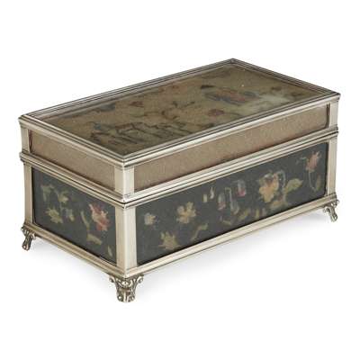 of rectangular form, the body with four glazed panels enclosing 18th century needlework panels depicting fruit and flower motifs, the hinged lid similarly set, depicting a gentleman, fruit tree and building, the side panels of plain design, all raised on bracket feet of scroll design, stamped 'CRICHTON & CO. LTD. STERLING/ 6706' to underside