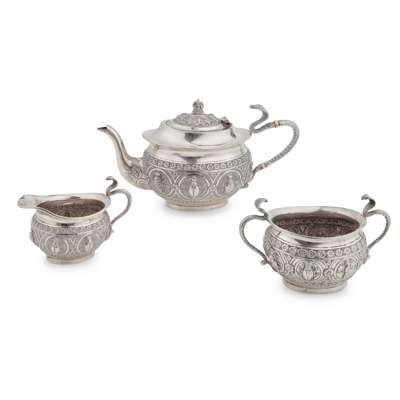 possibly Madras, comprising teapot, twin handled sugar basin and a milk jug, all of circular form, embossed insect detail to body, Hindu mythological depictions to hinged lid, the handles each modelled as cobras, raised on a circular foot