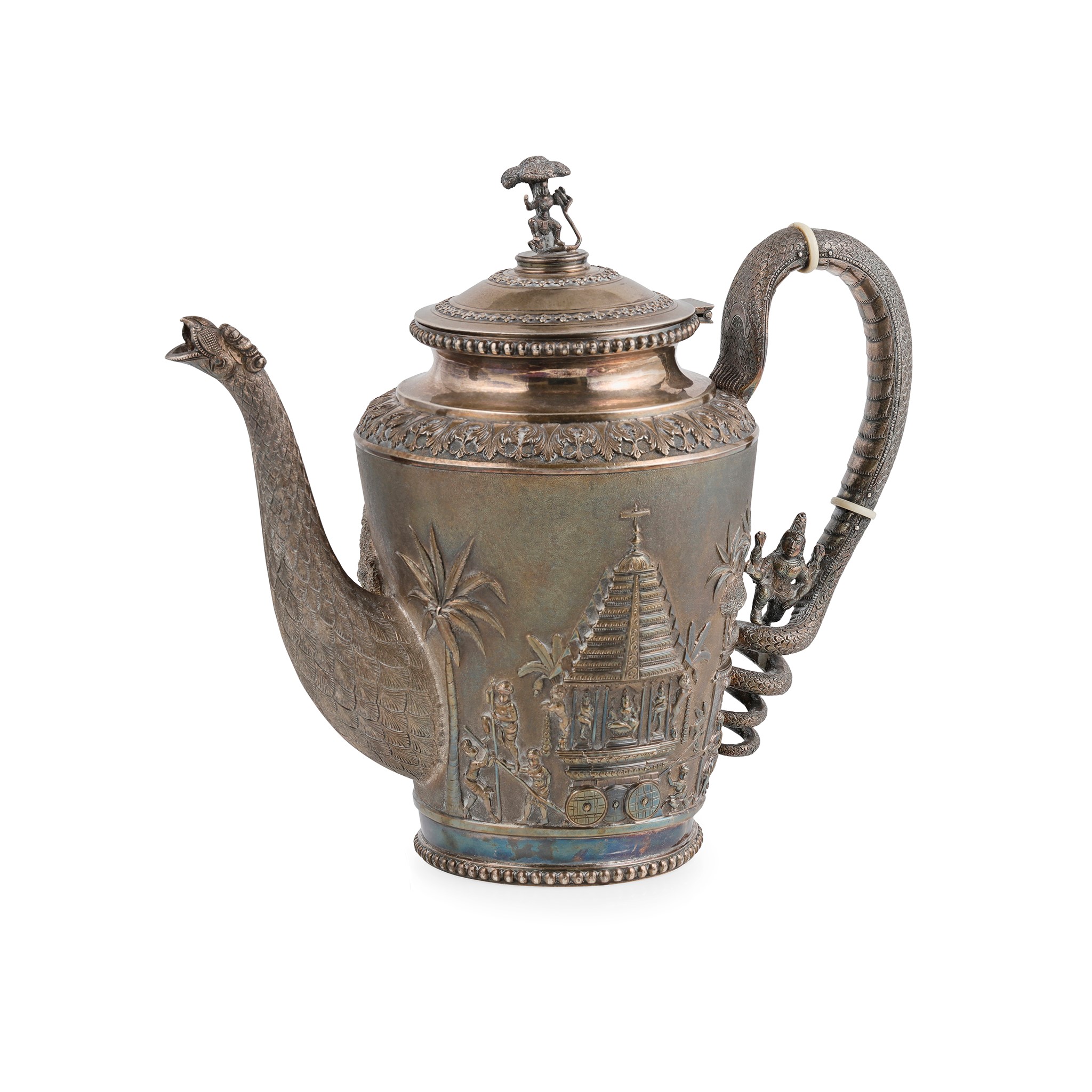 P. Orr & Sons of Madras, late 19th century, of tapered form, highly embossed Hindu depictions, with scenes of temples and animals, the curved spout modelled as a mythological feathered bird, the coiled handle of similar decoration with applied figure, the hinged lid with floral borders and applied finial depicting an individual overcoming a snake under a tree