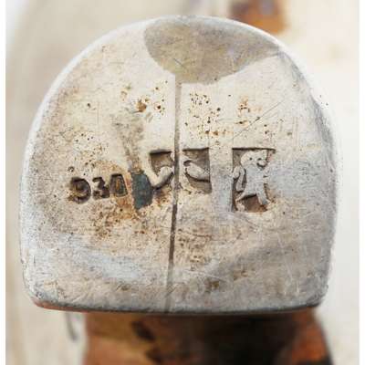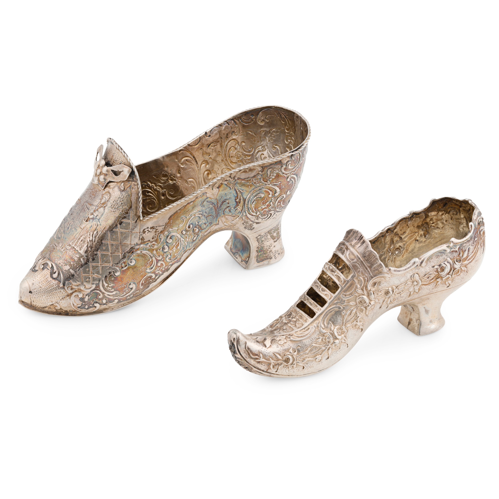with import marks, William Moering, London 1897, with embossed pastoral scenes throughout and applied bow to front; together with another similar smaller, marked to base of heel 930