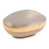 of irregular oval form, the base with moulded foot, the hinge and frame work to the base and hinged cover of unmarked yellow metal with engraved detail