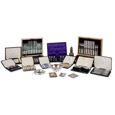Hamilton & Inches, Edinburgh 1944, of traditional form, presentation engraving to body and waisted lugs; together with a sugar caster, Birmingham 1972; together with a collection of teaspoons mainly Glasgow, other flatware, cased set of fruit knives, coffee bean spoons, and an enamel powder set