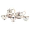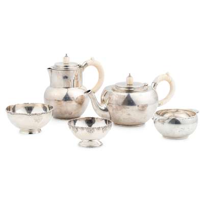 Edward & Sons of Glasgow, London 1933/4, comprising waterpot, teapot and twin handled sugar basin, all of globular form, the ivory handles of stylised trefoil design all raised on a circular foot; together with a sugar basin Josiah Williams & Co, London 1922, of circular form, floral border and a smaller similar stamped 925