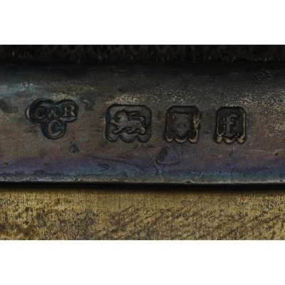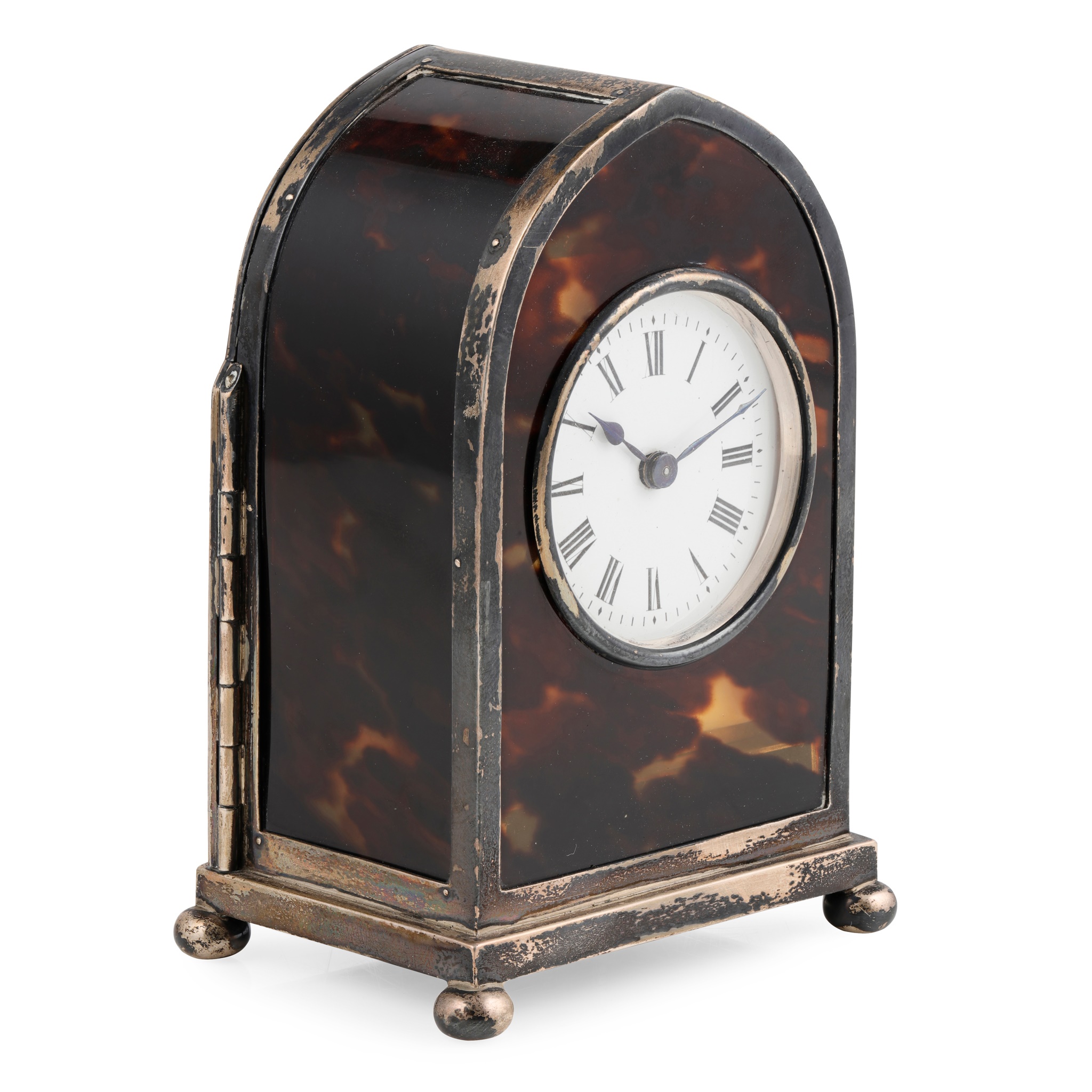 London 1921, of Lancet shape, the front and sides with inset panels of faux tortoiseshell, white dial with Roman numerals, plain movement with integral key, all on a plinth base, bun feet