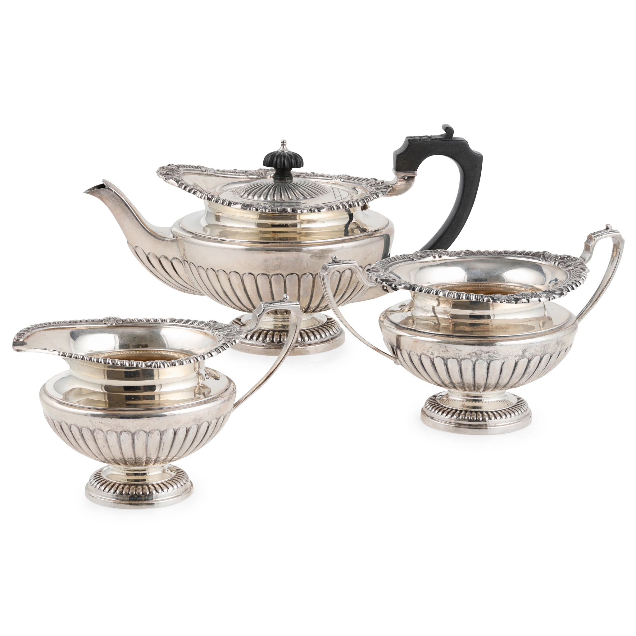Elkington & Co Ltd, Birmingham 1921, comprising teapot, twin handled sugar basin and milk jug, all of circular form, demi-fluted bodies with cast shell and gadrooned border, the handles of angular form, raised on a fluted circular foot