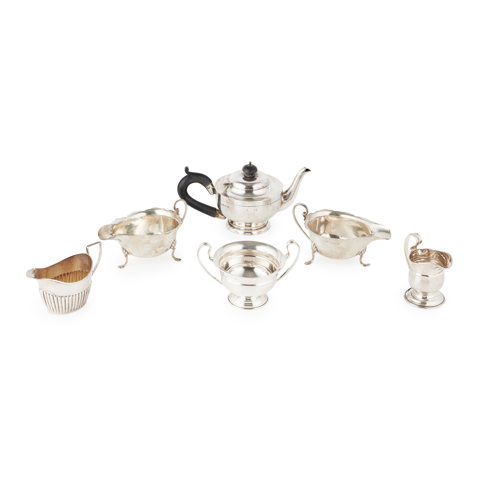 to include, a Bachelor’s teapot, Joseph Gloster Ltd, Birmingham 1912, of circular form, A.H. engraved to body; together with a pair of sauce boats, Birmingham 1926, of traditional form, with scalloped border; a twin handled presentation trophy, Birmingham; and two milk jugs both Birmingham