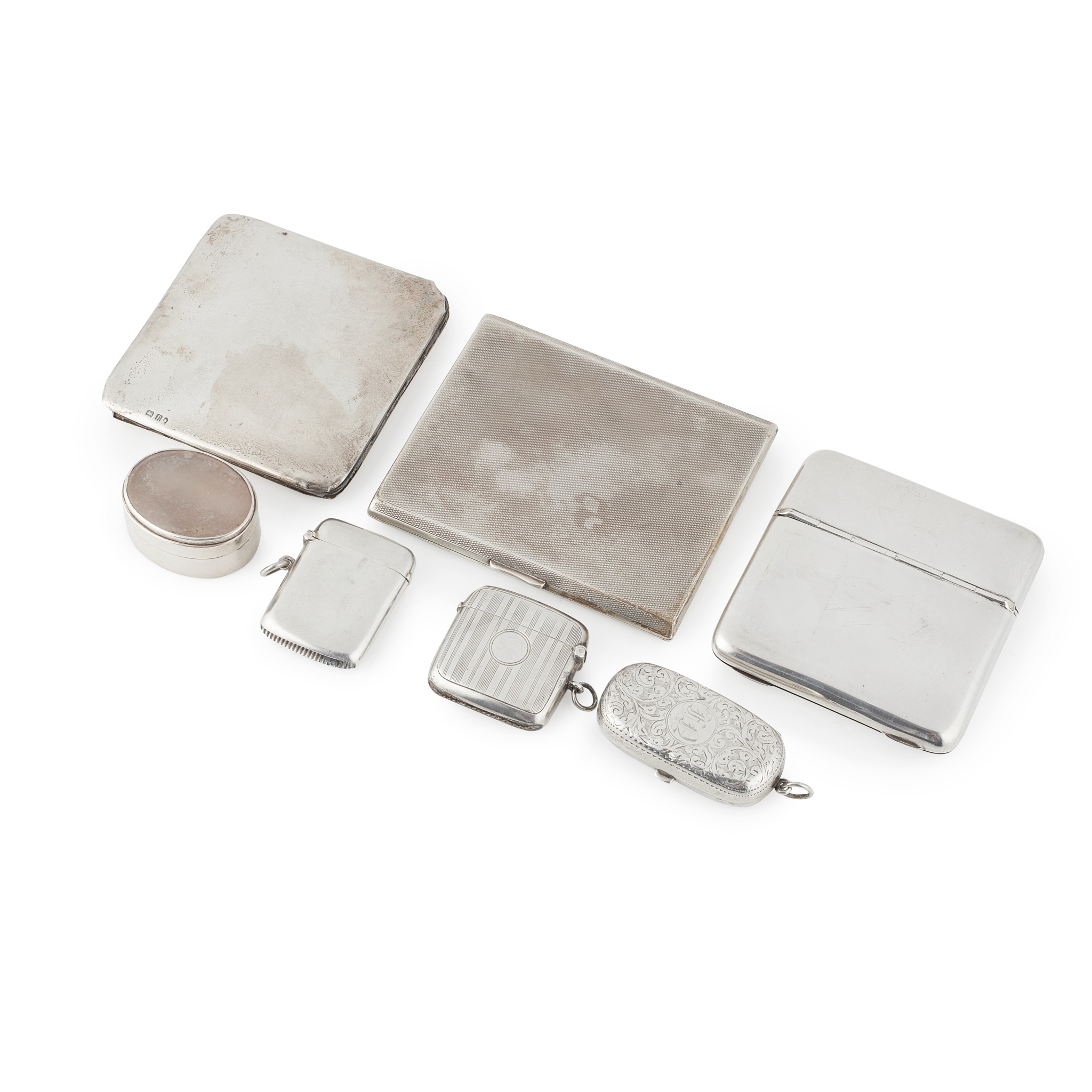 to include, a small patch box, T.H.H., Birmingham 1911, of oval form, the pull off lid inset with a moss agate; together with a collection of card, cigarette and vesta cases to include, an engine turned cigarette case; a double ended case with sovereign compartment, a compact; together with two vesta cases and sovereign and half sovereign case