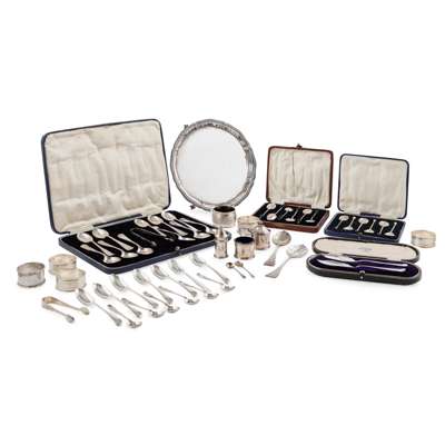 to include various cased sets of teaspoons, coffee spoon, napkin rings; together with a card tray