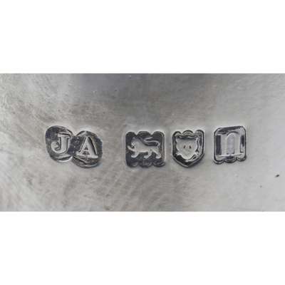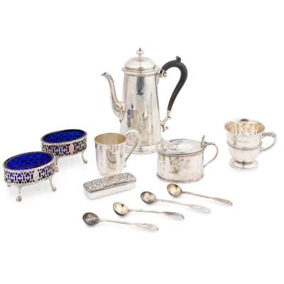 Joseph Angell II, London 1908, of plain tapered form, stepped foot, the domed lid with turned finial, the handle of S scroll form, leaf clasped spout; together with a pair of George III salts, Hester Bateman, London 1777, of pierced oval form, gadrooned border and cartouche to centre with Gothic P engraved, each raised on four ball feet; together with a Georgian mustard pot, four condiment spoons, of Fiddle pattern, two mugs and a dressing table pin box