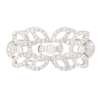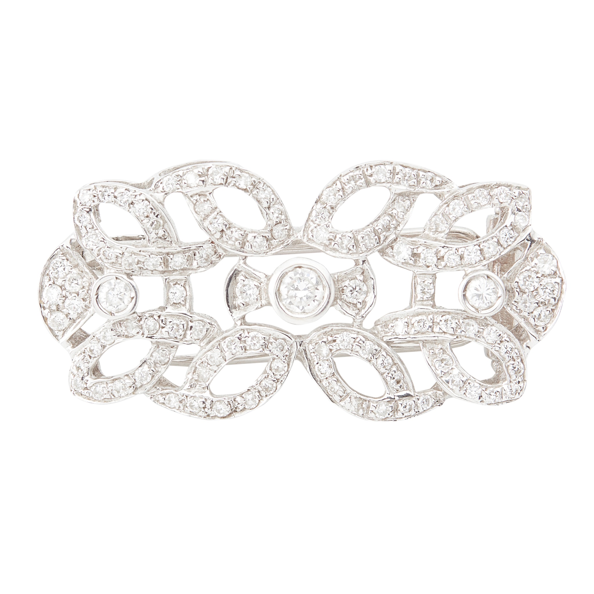 of open scrolling form, set throughout with graduated round brilliant-cut diamonds, to a double pin fitting, stamped 750