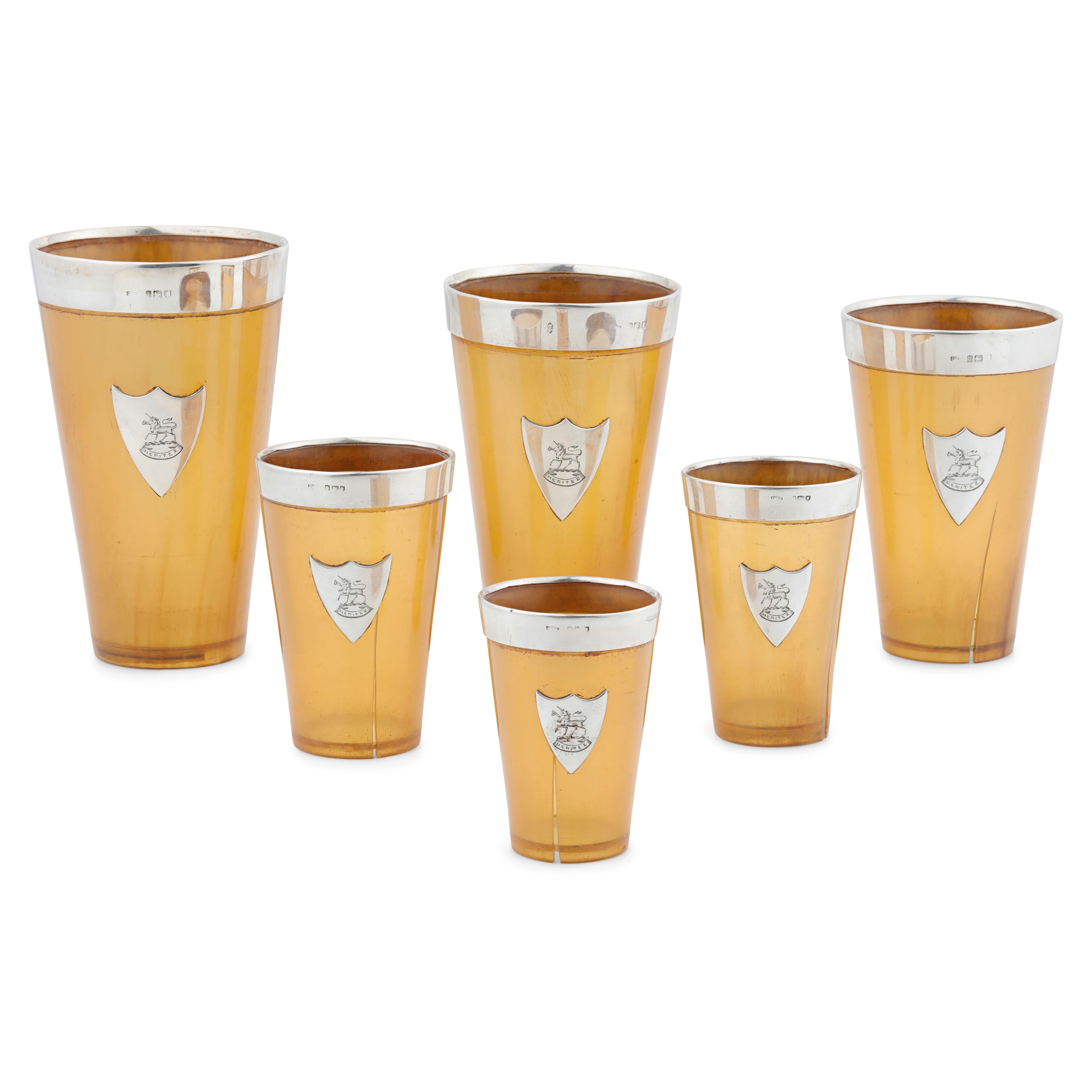 A cased part set of silver mounted horn beakers