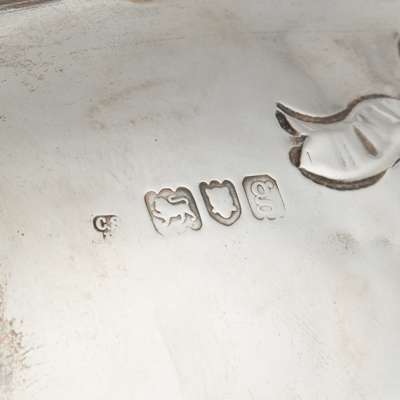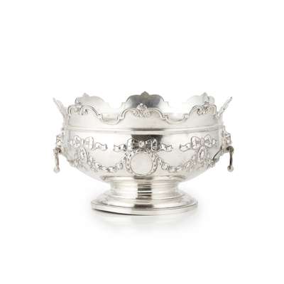 London 1902, of traditional form, cast moulded fixed border, embossed swag and bow motifs to body with two vacant circular cartouches, the loop handles with cast lion mask faces, raised on a stepped circular foot