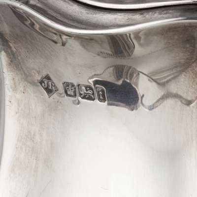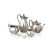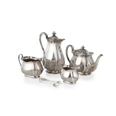 James Ramsay (of Dundee), Sheffield 1901, comprising water-pot, teapot, twin handled sugar basin and milk jug, all of baluster form, with demi-fluted bodies, the handles of C scroll form, all raised on a stylised oval foot; together with a novelty pair of plated sugar tongs modelled as bird's claws