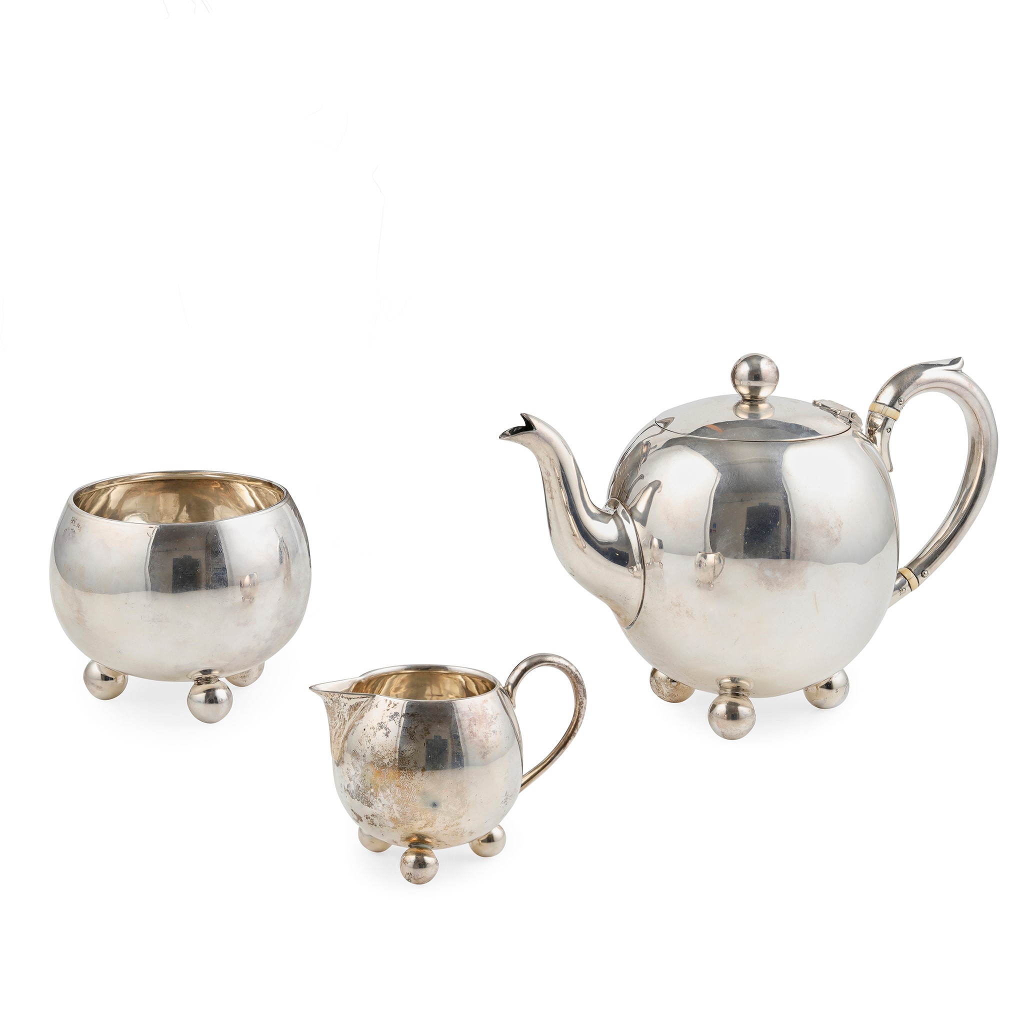 Mappin & Webb (John Newton Mappin), Sheffield 1883/84, comprising a bullet shaped teapot, sugar basin and milk jug, all of spherical form, C scroll handle to teapot and milk jug, each raised on three ball feet