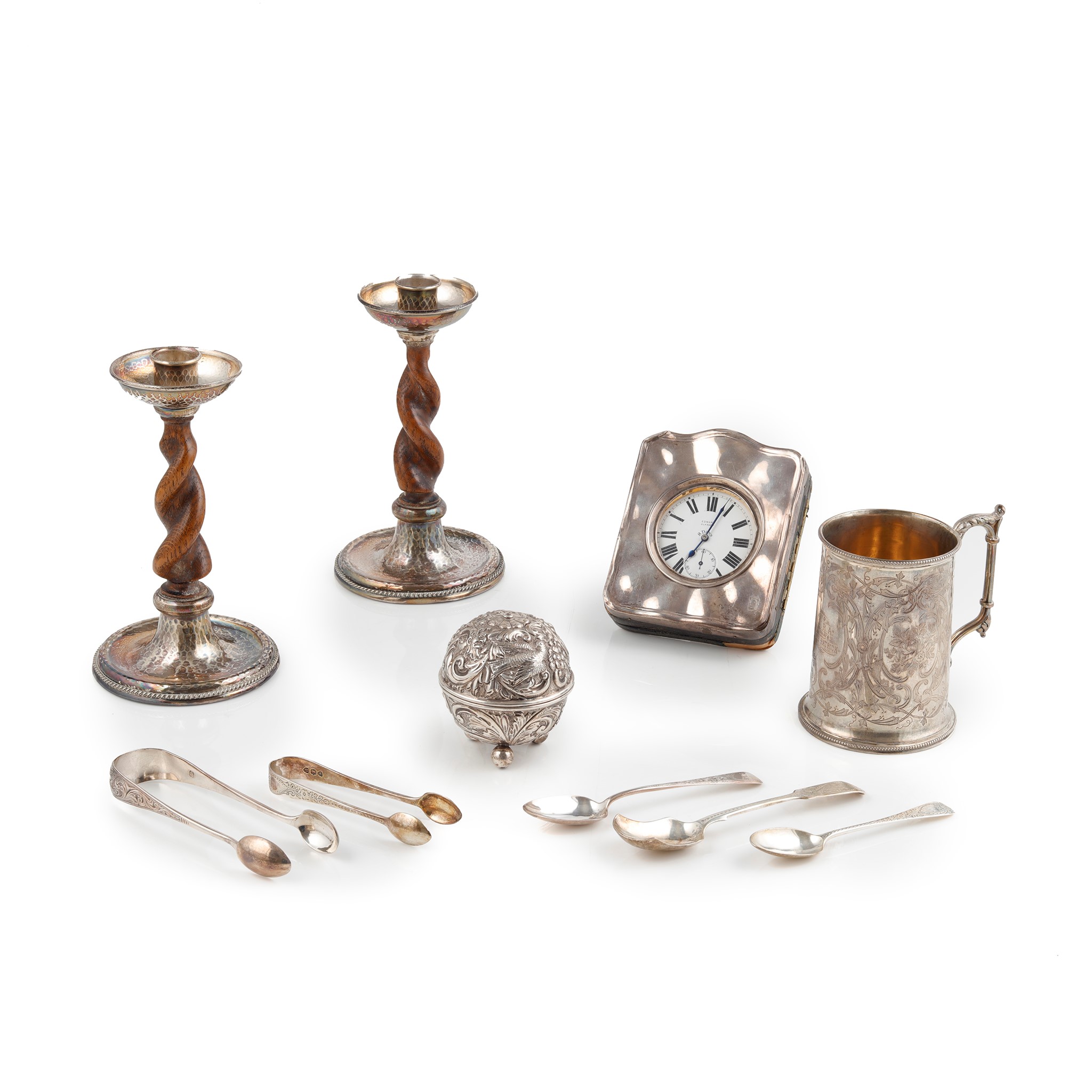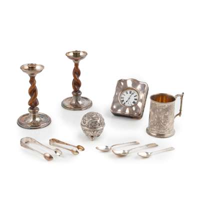 to include a string holder, William Comyns, London 1894, of spherical form, all over embossed decoration with bird and floral depictions, raised on four ball feet; together with a Victorian mug, of tapered form, engraved decoration throughout; a cased pocket watch; a pair of plated candlesticks, the wooden stem of twisted form; together with a collection of various teaspoons, tongs, sugar shovel etc.