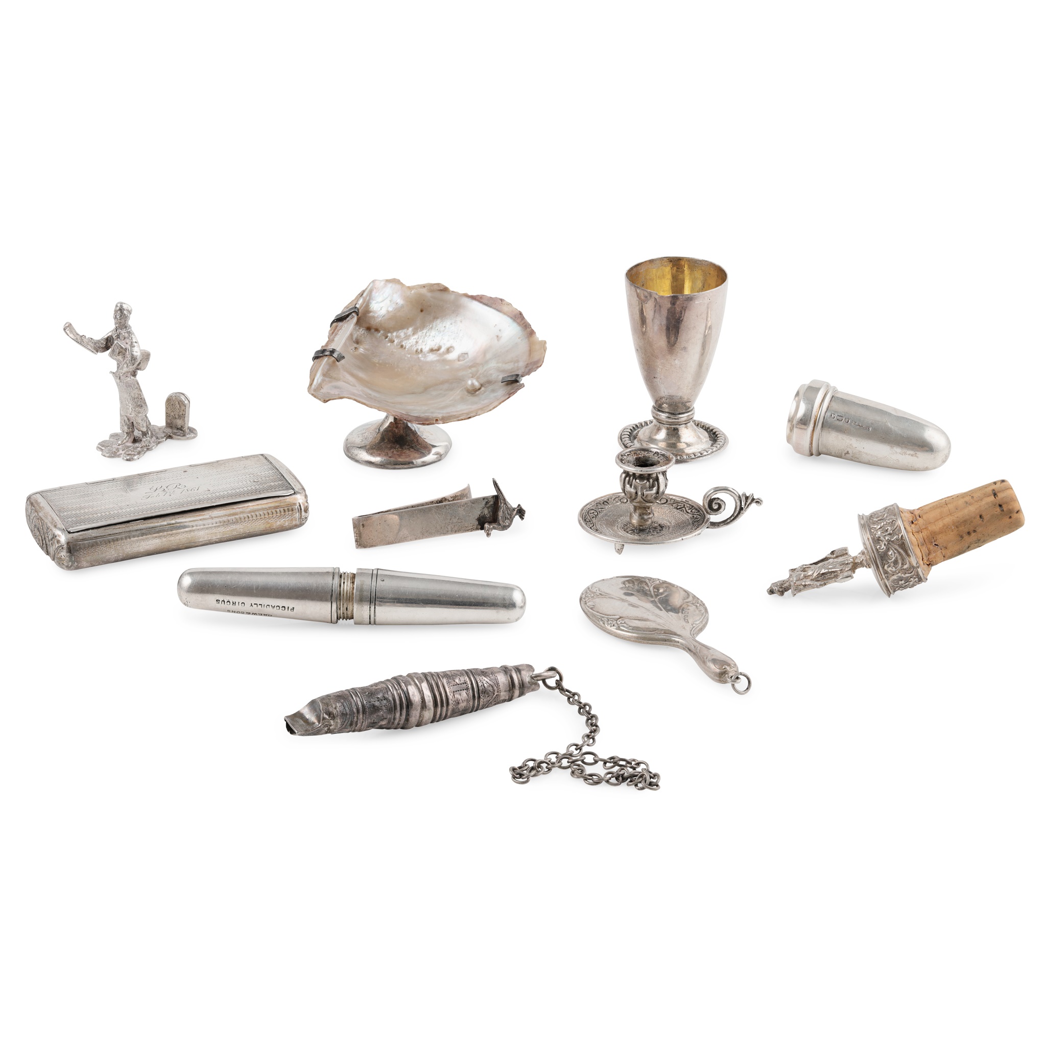 to include, a George III snuff box E Smith, Birmingham of rounded rectangular form; miniature chamber stick; hand mirror; chalice; corkscrew; whistle; small silver model of a news vendor; milk maid bottle stopper; needle case