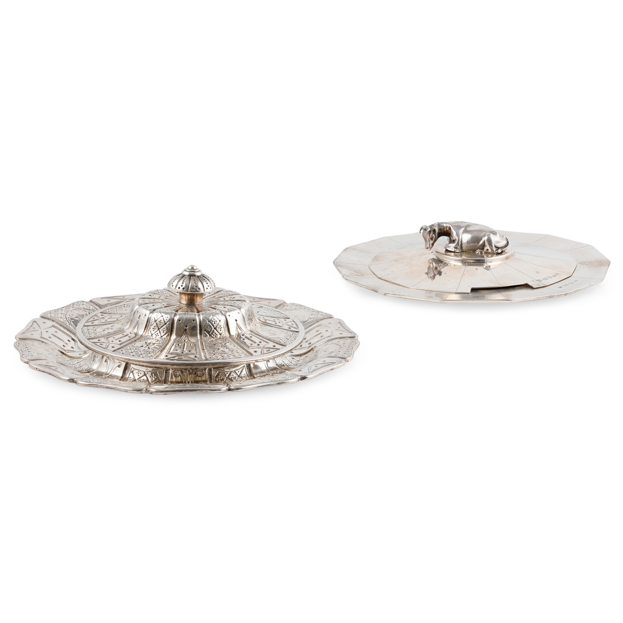 Henry Wilkinson & Co, London 1843, of tetradecagon panelled form, the lid with applied milking cow, simple line detail; together with another base and cover, J. Hunt of Hunt & Roskell, London 1874, of similar form, embossed and engraved detail to each panel, the lid of domed form and bun finial, both glass dishes lacking