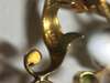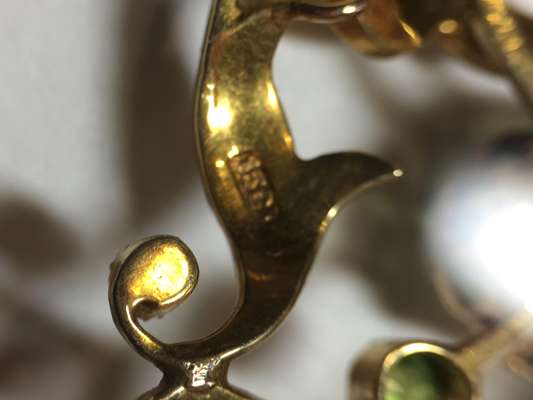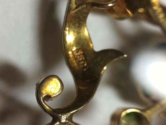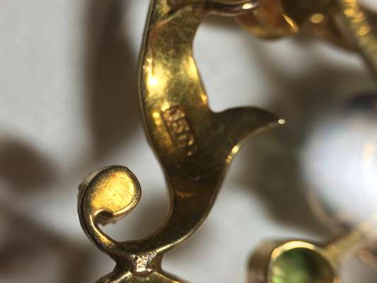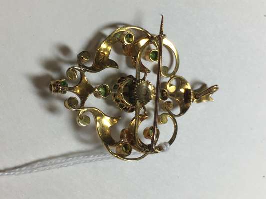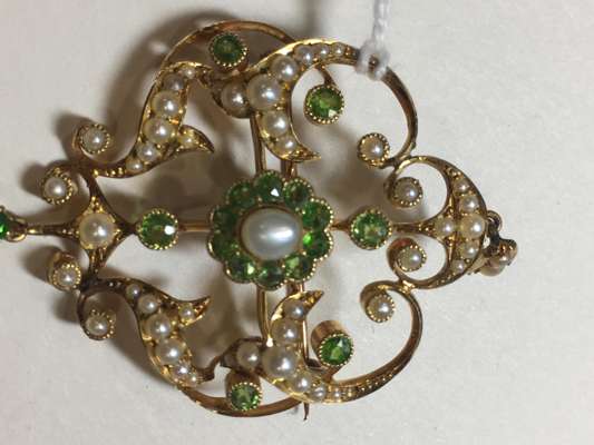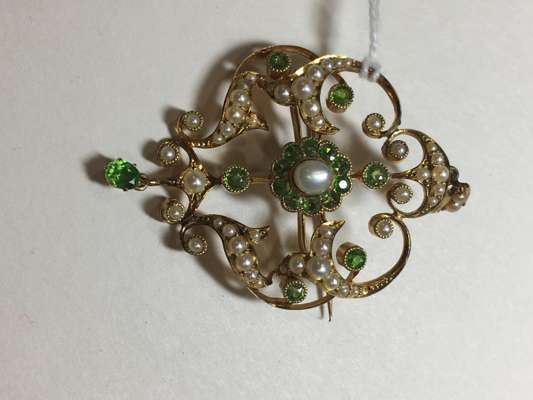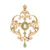 of open scrolling form, set throughout with graduated seed pearls and round-cut peridots, suspending an oval peridot drop, stamped 15ct, with detachable brooch fittings