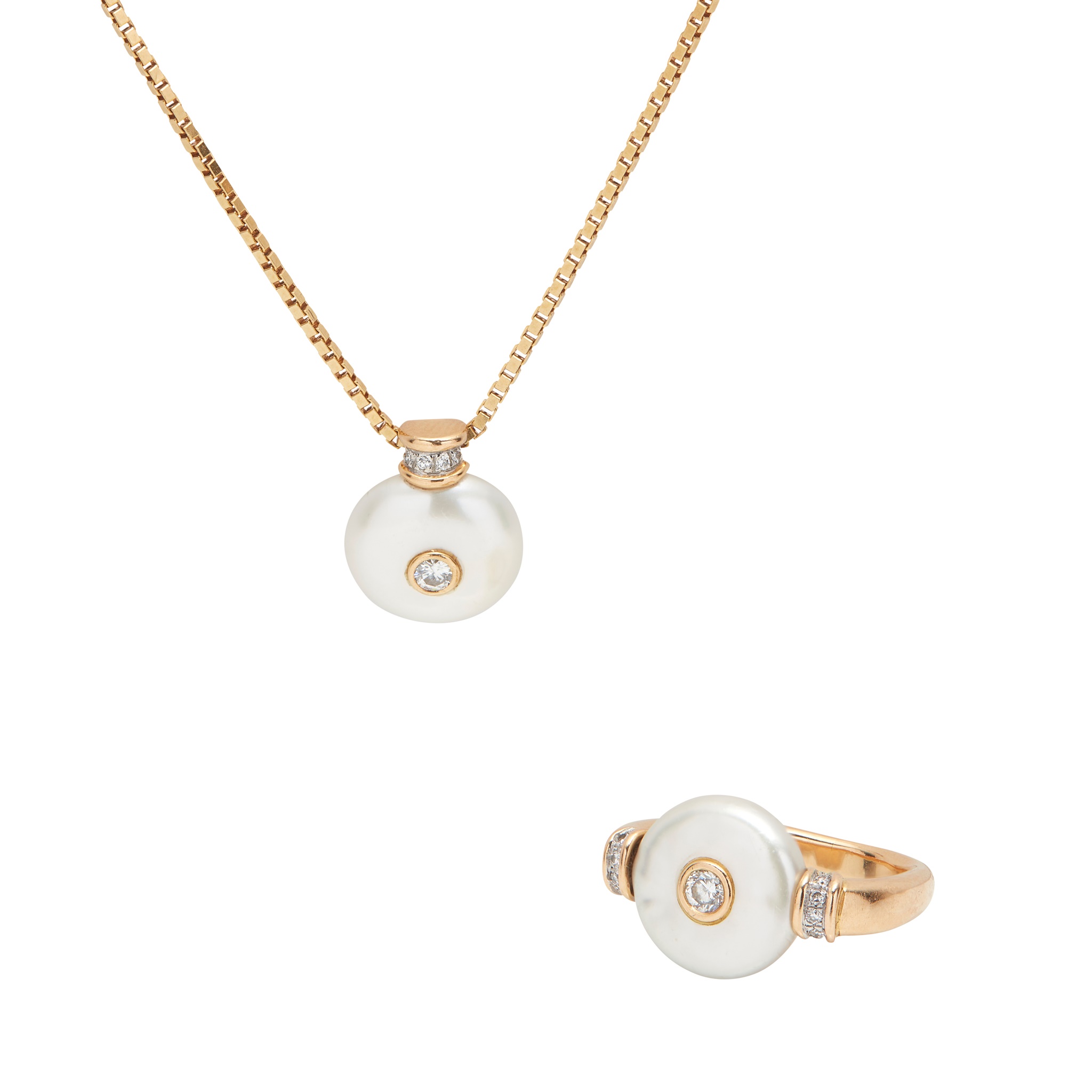 each set with bouton pearl, collet set to the centre with a small round brilliant-cut diamond, the ring with four small round brilliant-cut diamonds to each shoulder, the pendant to a box link chain, both stamped 750