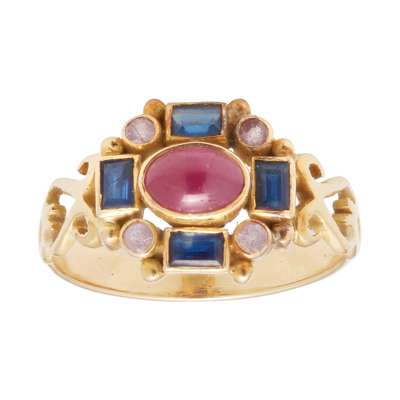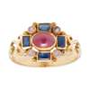 collet set with a ruby cabochon, in a border of baguette-cut sapphires and small round-cut pink sapphires, scrolling detail to shoulders, to a plain unmarked shank