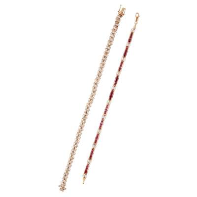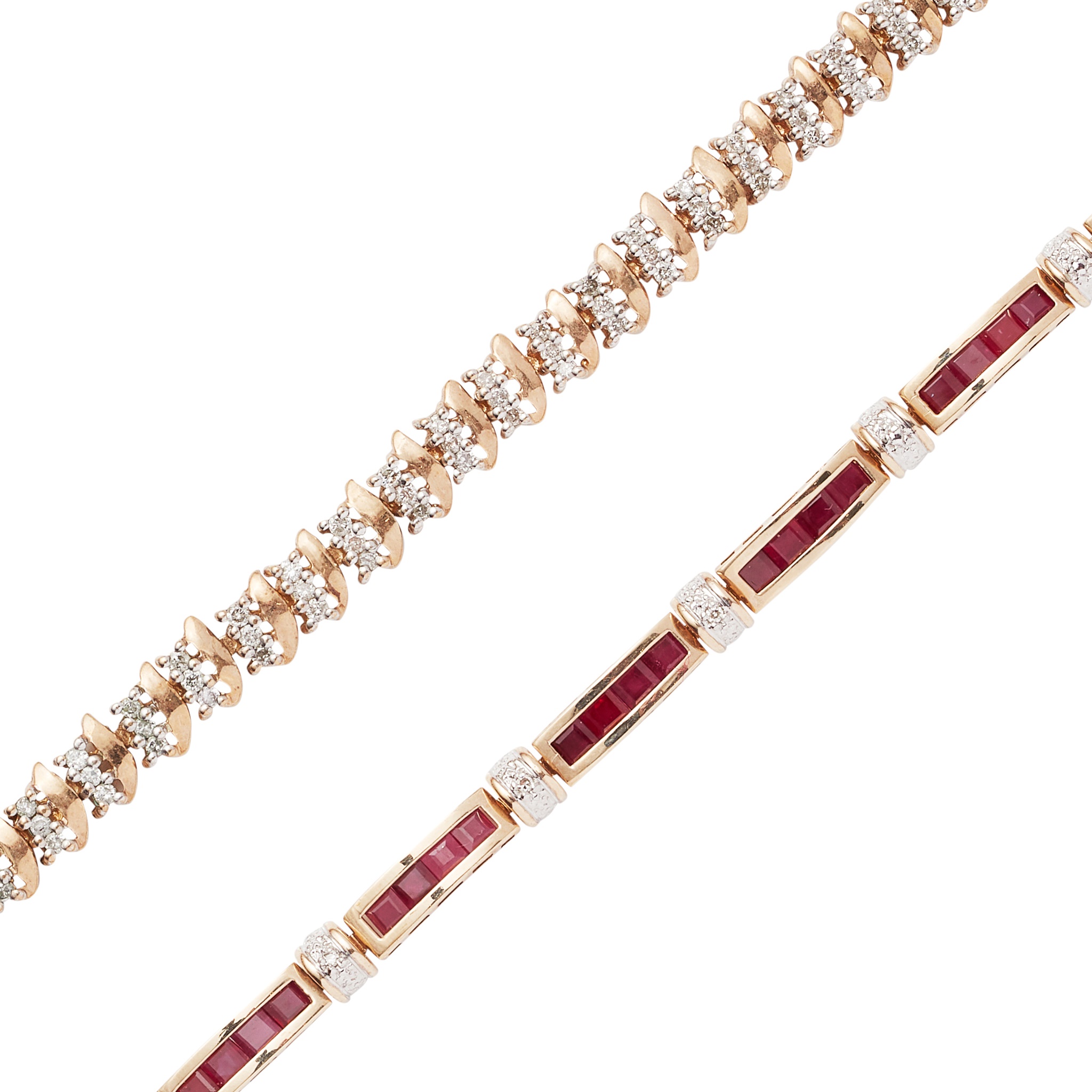 composed of rectangular links channel set with four square-cut rubies and alternating beaded links set with a small eight-cut diamond, to a lobster type clasp; together with a 9ct gold diamond set bracelet, composed of alternating polished S-shaped links and trios of small round brilliant-cut diamonds, to a concealed clasp and safety clip
