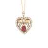 modelled as a heart with scrolling detail, set throughout with graduated old round-cut diamonds and eight-cut diamond detail, suspending a central oval-cut ruby drop