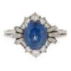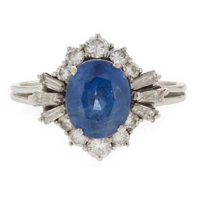 claw set with an oval-cut sapphire, in a border of ten graduated round brilliant-cut diamonds, and six tapered baguette-cut diamonds, to an 18ct white gold ribbed shank