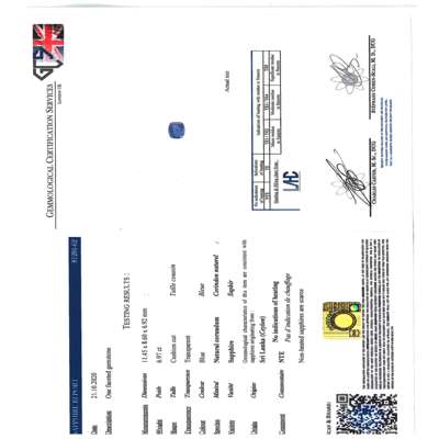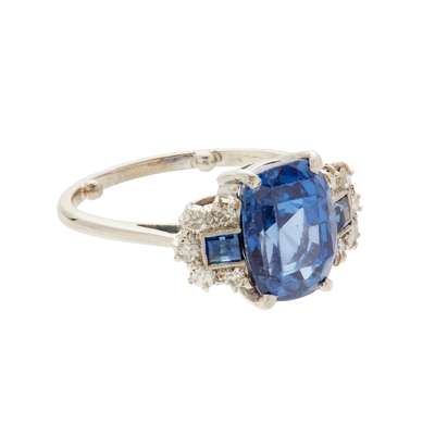 claw set with an oval cushion-cut diamond, each shoulder set with a square-cut sapphire in a border of five eight-cut diamonds, to a plain unmarked shank; together with an accompanying report by Gemmological Certification Services, dated 21.10.2020, numbered 81281-62, stating that the sapphire is 6.97cts, of Sri Lankan origin showing no indications of heat treatment