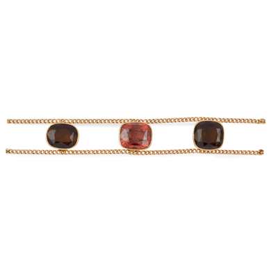 collet set with two cushion cut tourmalines and three cushion-cut zircons, all brownish-green to brownish-orange, to a double row curb link bracelet and box clasp, unmarked