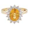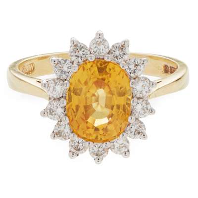 claw set with an oval mixed-cut yellow sapphire, in a single border of fourteen round brilliant-cut diamonds, to a plain 18ct yellow gold shank