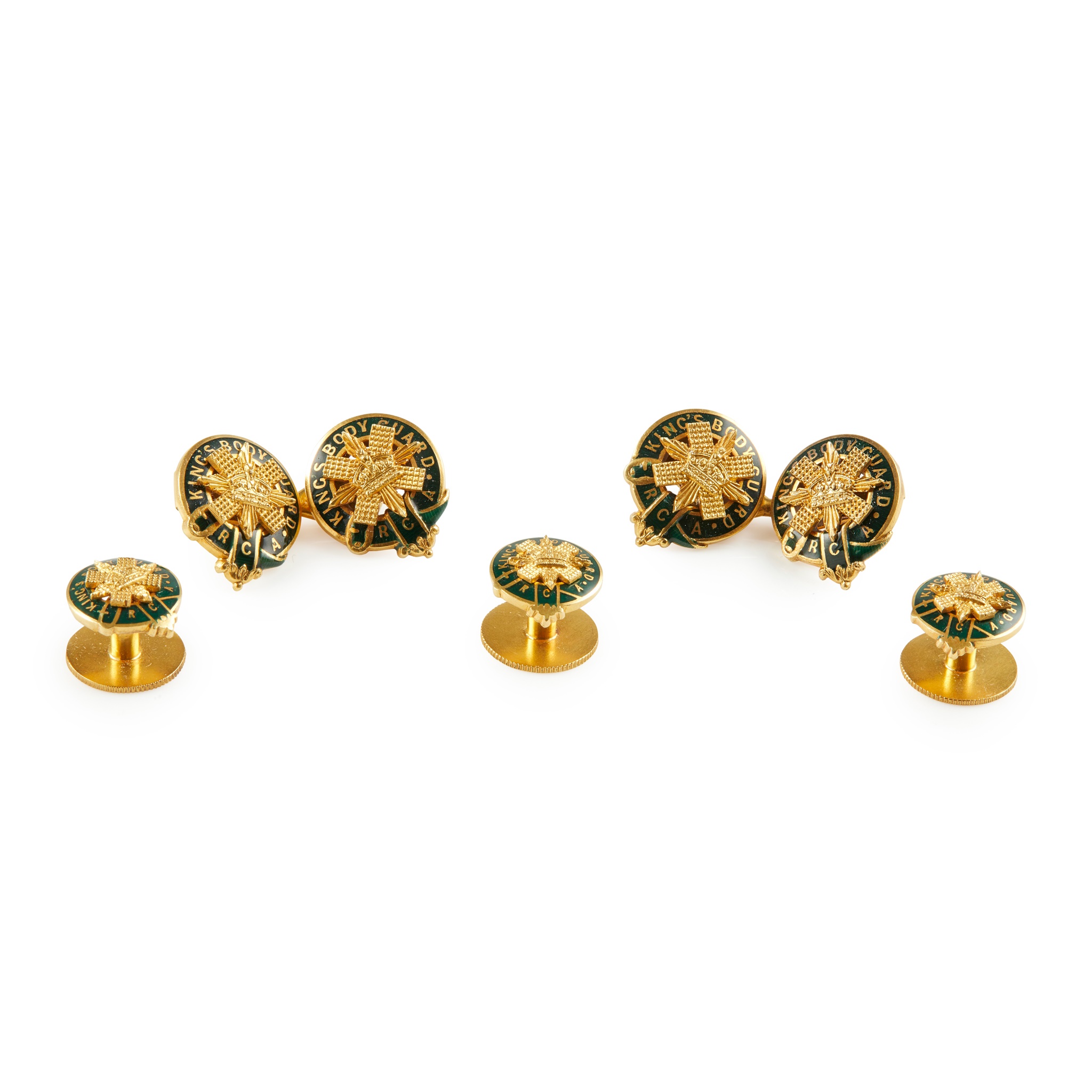 to include pair of cufflinks and three dress studs, with enamel detail and insignia for ‘The Kings Bodyguard’ to each terminal, stamped B&S, in a fitted box, by Brook & Sons ... Edinburgh