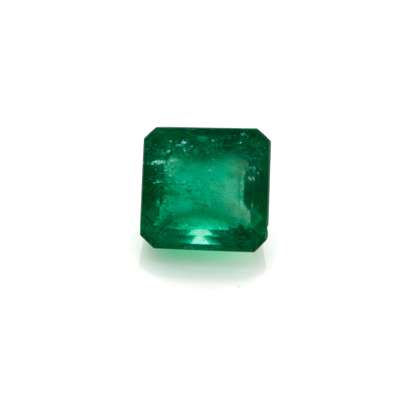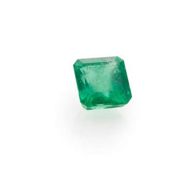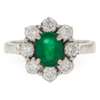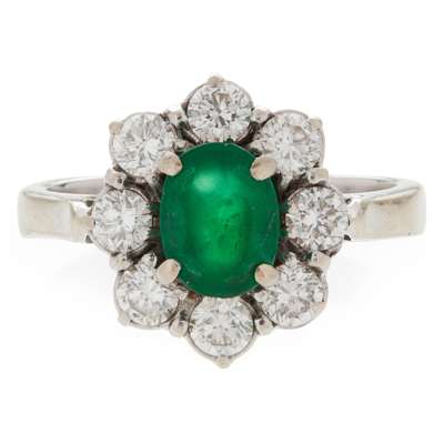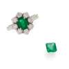 claw set with an oval-cut emerald in a border of round brilliant-cut diamonds, to a plain 18ct white gold shank; together with a loose square cut emerald