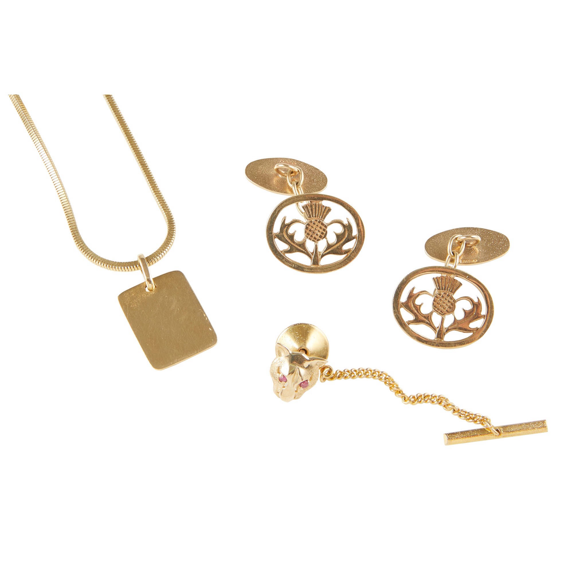 the principal terminals with pierced thistle design; together with a tie-stud modelled as a leopard’s head with ruby set eyes, unmarked; and an 18ct gold snake link chain, suspending a plain rectangular 14ct gold pendant