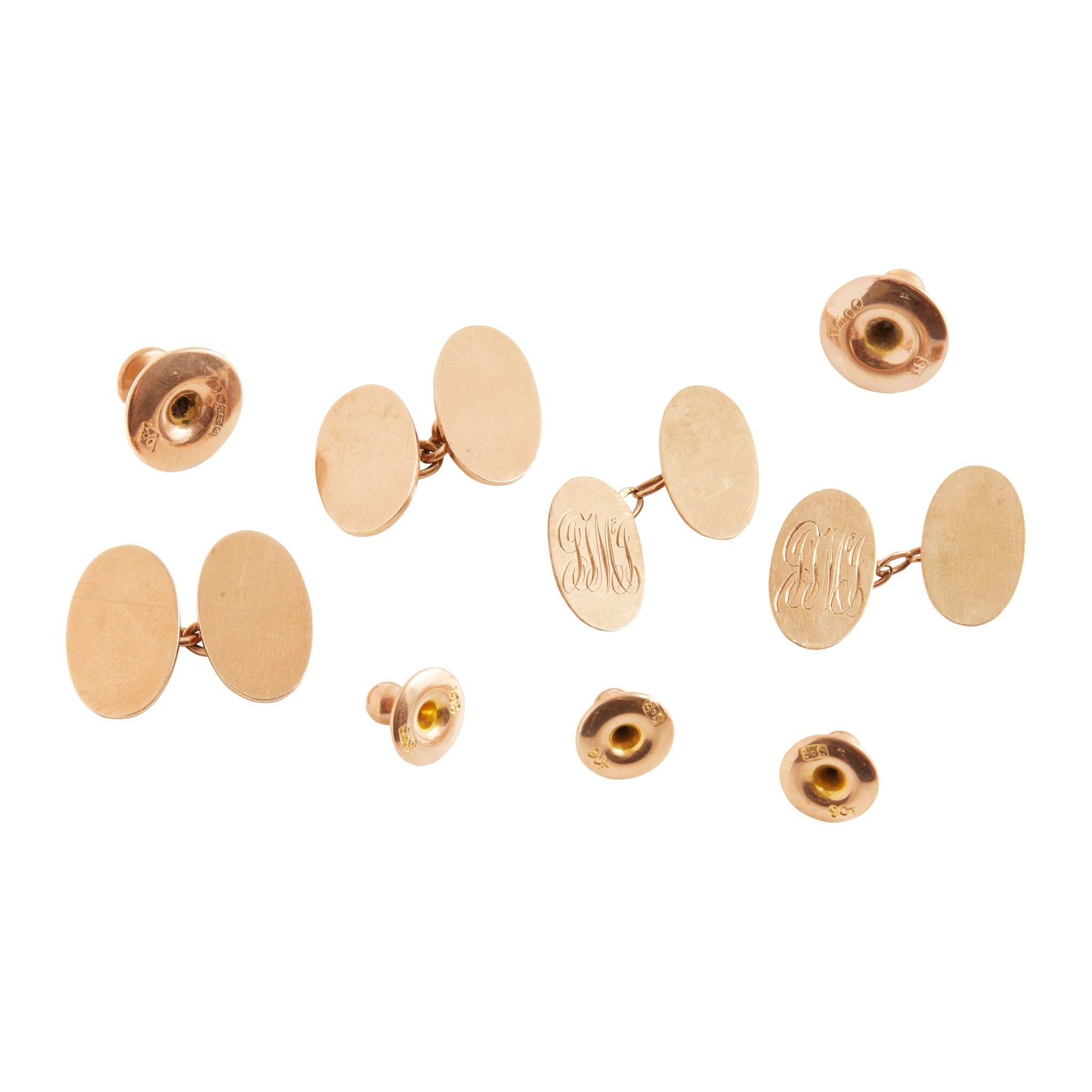 each terminal of oval form, to belcher links, with three dress studs stamped S.S. 9CT; together with another similar pair, engraved italic initials to one oval terminal, with a pair of 9ct studs