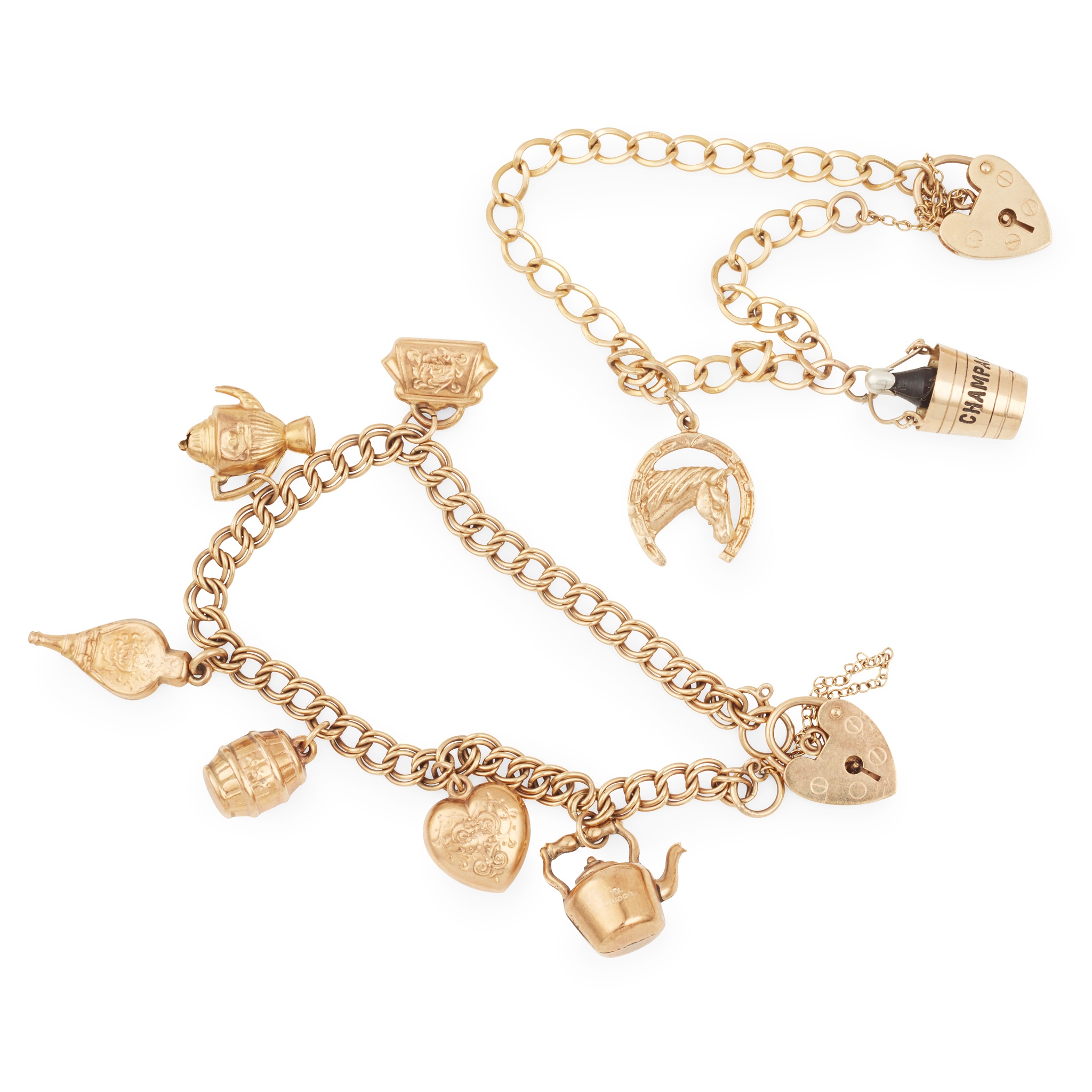 the curb link bracelet to a 9ct gold padlock clasp, suspending a champagne bucket and a horse-shoe charm; together with another unmarked double curb-link bracelet, to a 9ct gold padlock clasp, suspending various charms